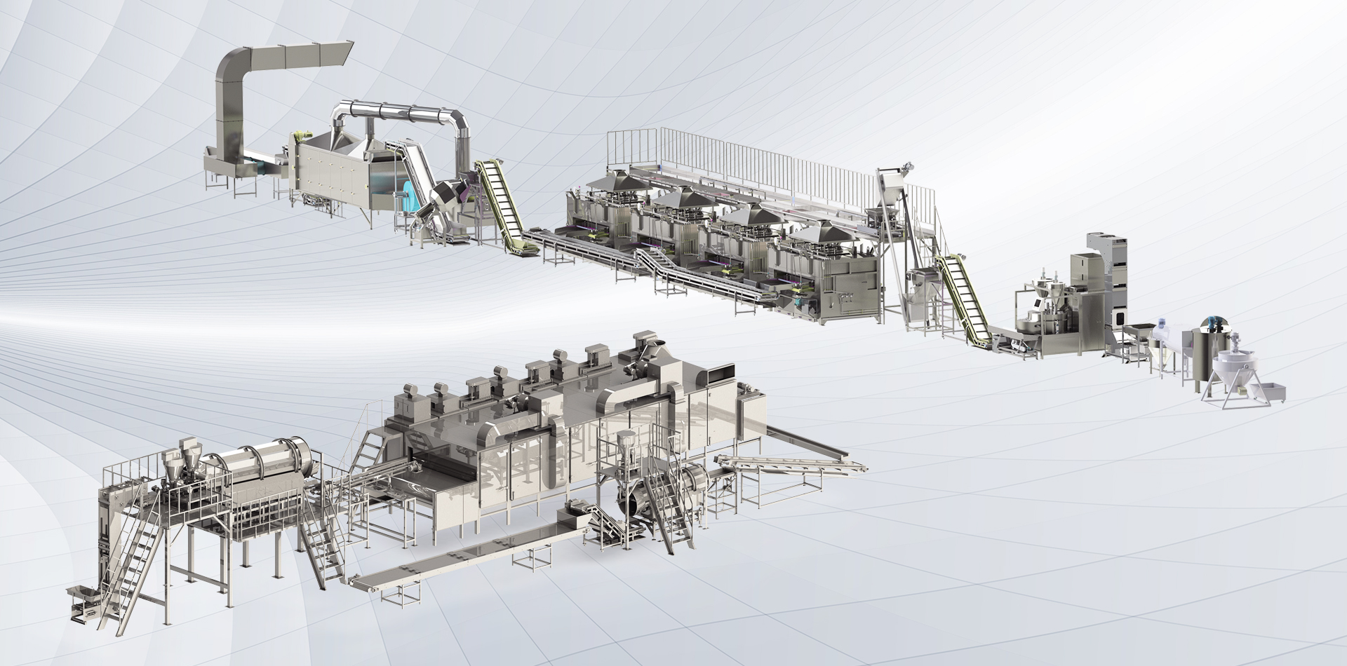 該生產(chǎn)線廣泛用于堅(jiān)果、籽類、裹粉顆粒食品、薯片、薯?xiàng)l、膨化食品等加工生產(chǎn)。